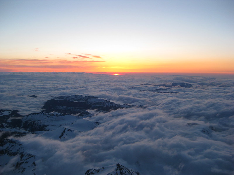 Now, it seems steeper still and the wind is really howling. I am thankful that we have goggles, they were necessary. Start to try some sideways walking. We cross a snow bridge over a crevasse. I am starting to feel tired; but not too bad. At our third break (about 330), a couple of people turn back with one of our guides. Our remaining three rope teams head up. It’s steep and hard; now I am very physically tired. Have to pull in mental reserves. The rosy fingers of dawn are emerging on this section.