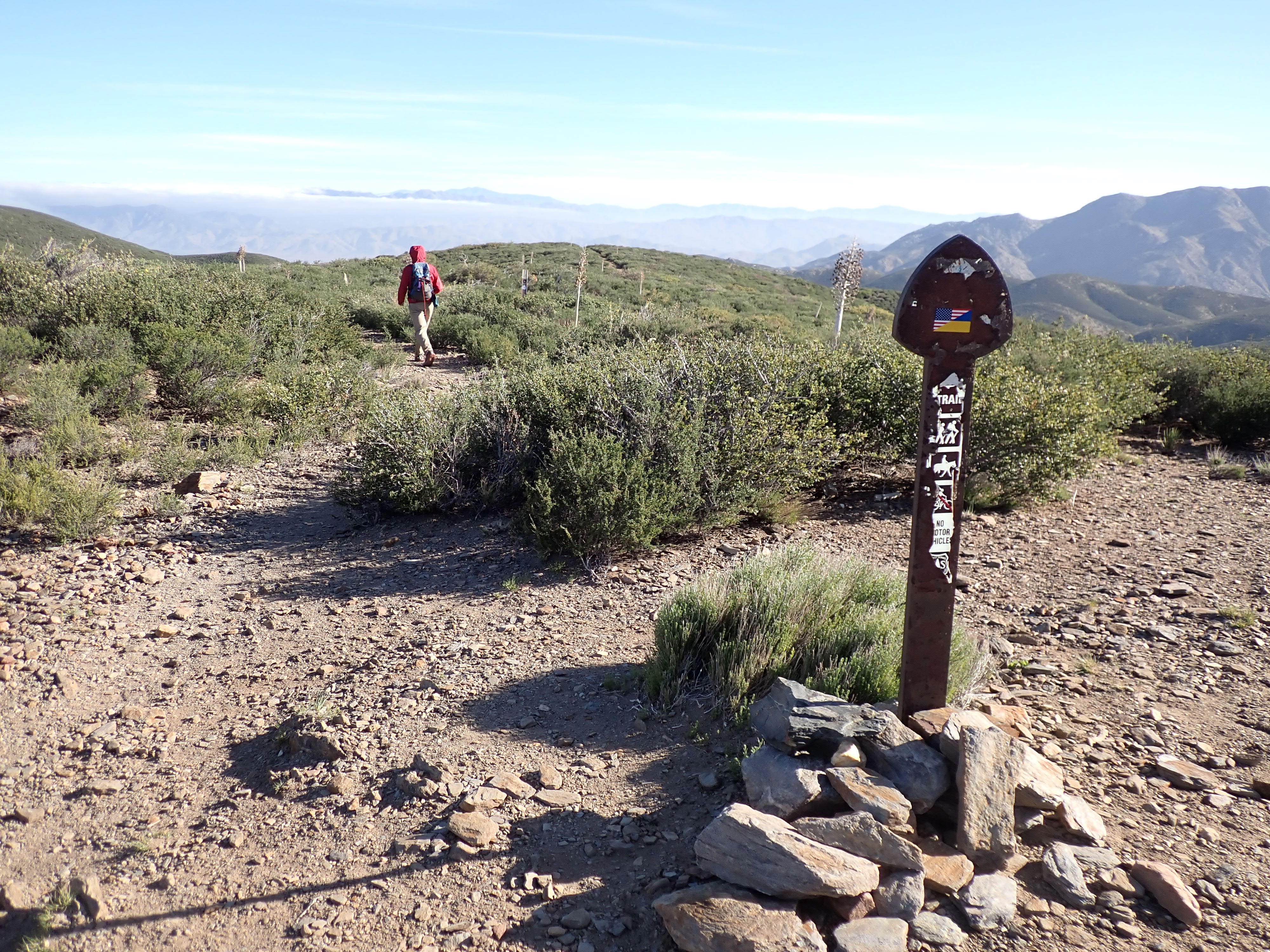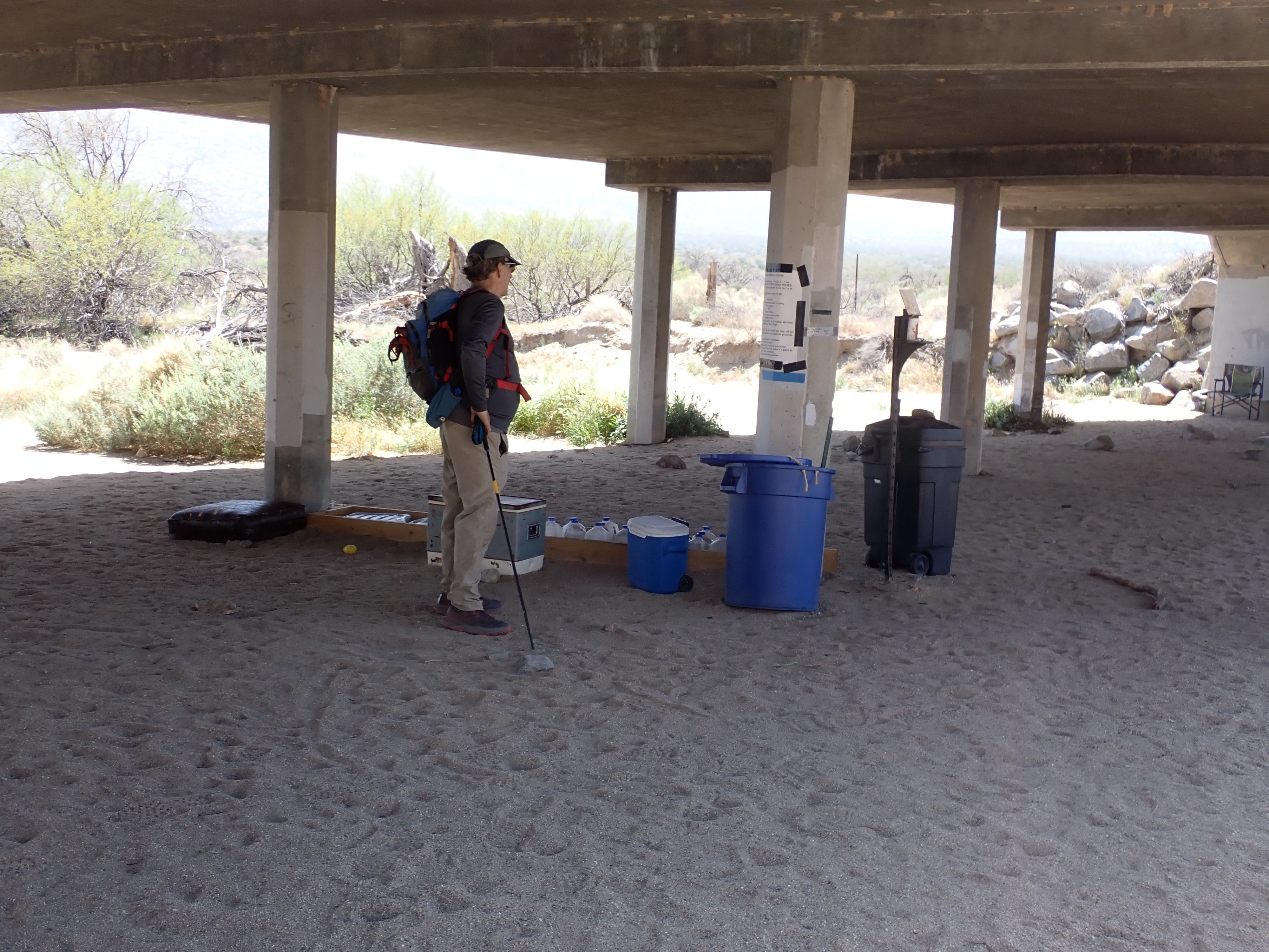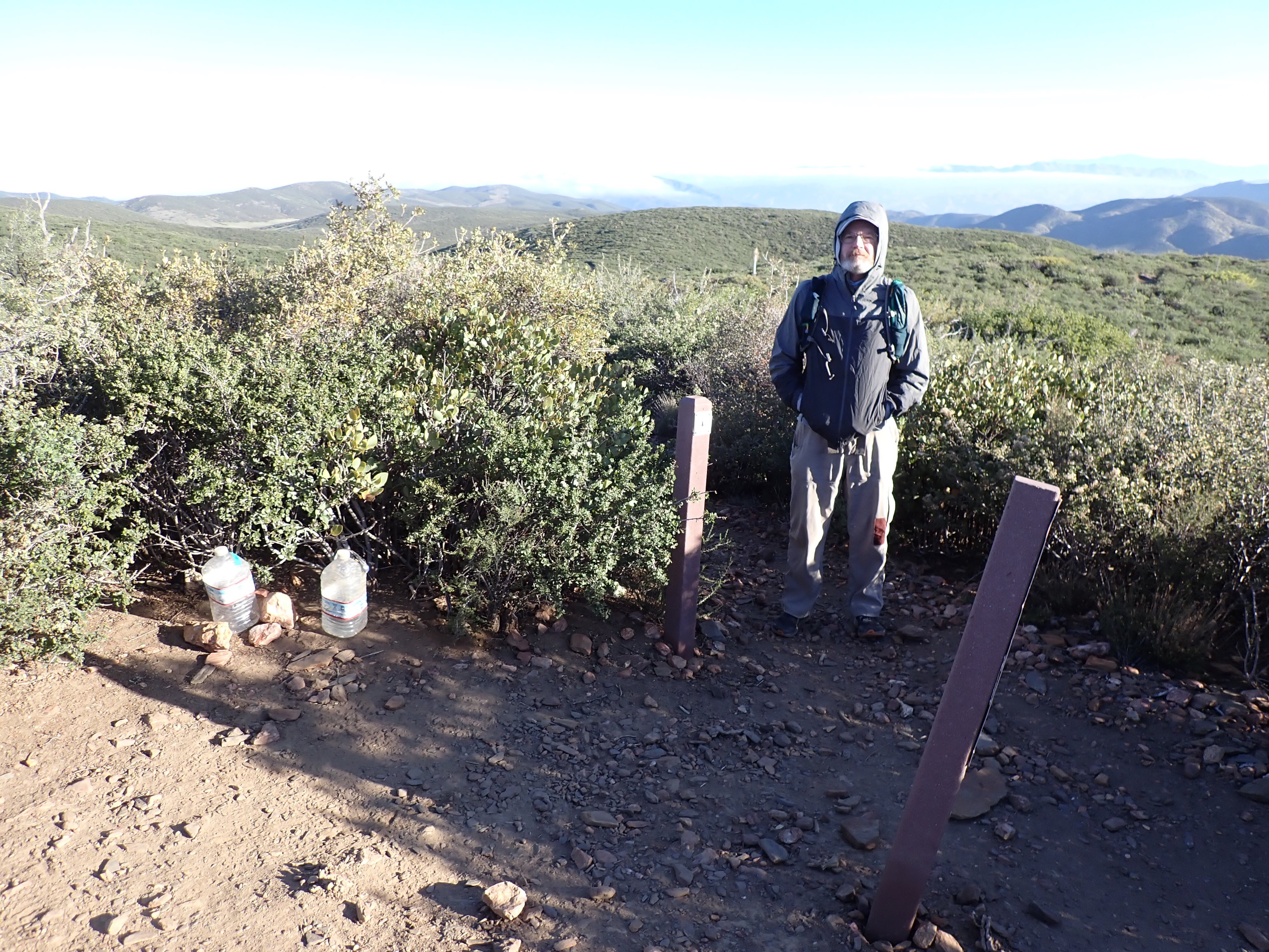 I had an internal transition; from feeling decent to quite nauseous. I’m sure that my churning guts didn’t improve my personality. I let Mike know and he paced me out. (Mike – thanks for putting up with me) When we got to Julian, I bought a six pack of diet ginger ale. I had one and felt better. A bit later I drank another. The next morning I still wasn’t 100%. Mike had great advice, bring ginger ale along in my pack. That was sage advice, it helped get my guts settled. On the way out, at Scissors Crossing, we investigated the water cache, It was large and well-organized. (We had seen an unmaintained water cache the previous day; the insects and other small critters would have made for an interesting nature study).