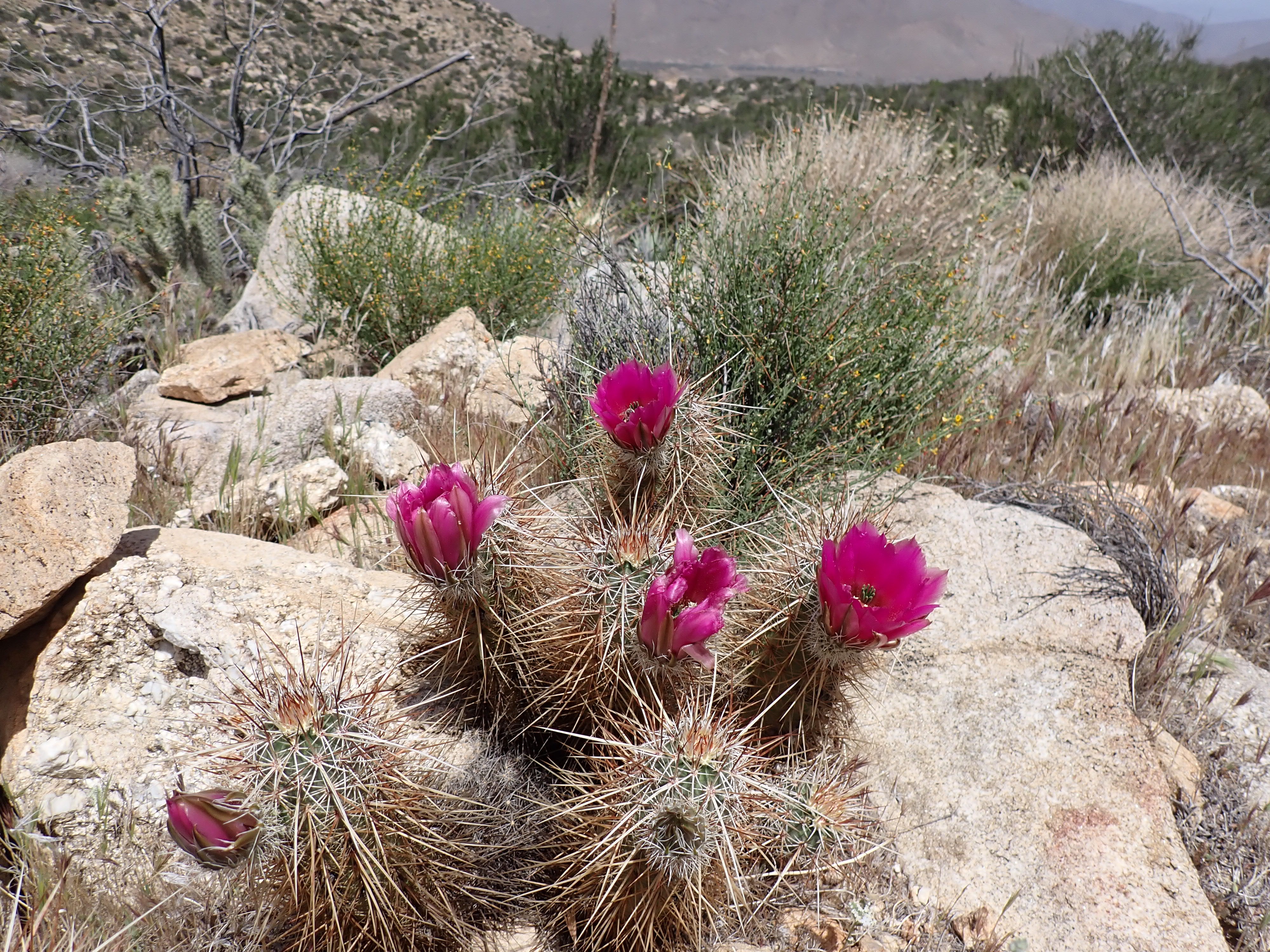 I’m still learning about the ecology of the area but my guess is that we transitioned from chaparral to desert at some point. One delight was seeing the cactus start to bloom. My favorite cactus of the day was flowering Engelmann’s Hedgehog Cactus (Echinocereus engelmannii) The photo’s show one example, look closely at the flower and you’ll see a bee working the bloom over. There’s pollen scattered around the flower; it was good to see a pollinator at work.