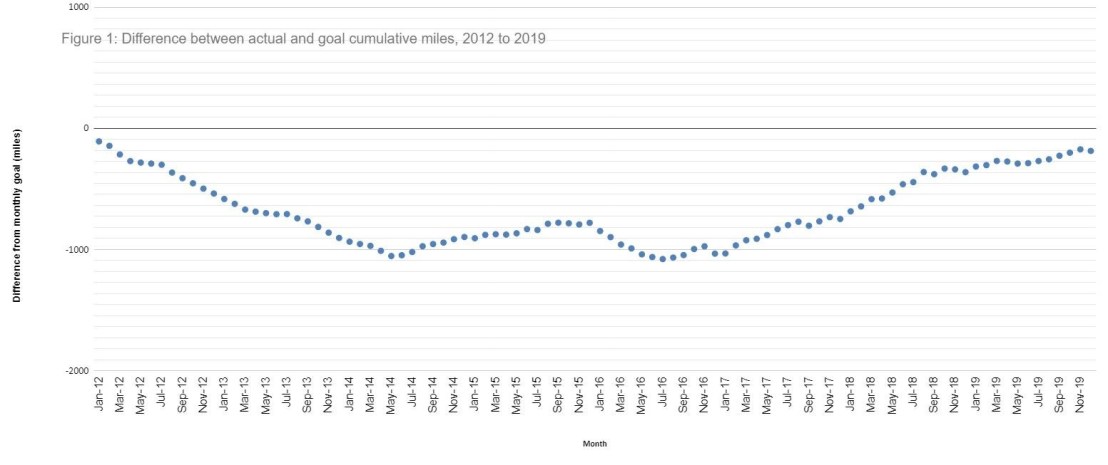 Once I had my goal and actual monthly mileage, I can compute the difference. A negative number indicates that I am less than my goal. Figure 1 shows the cumulative difference from goal over eight years.