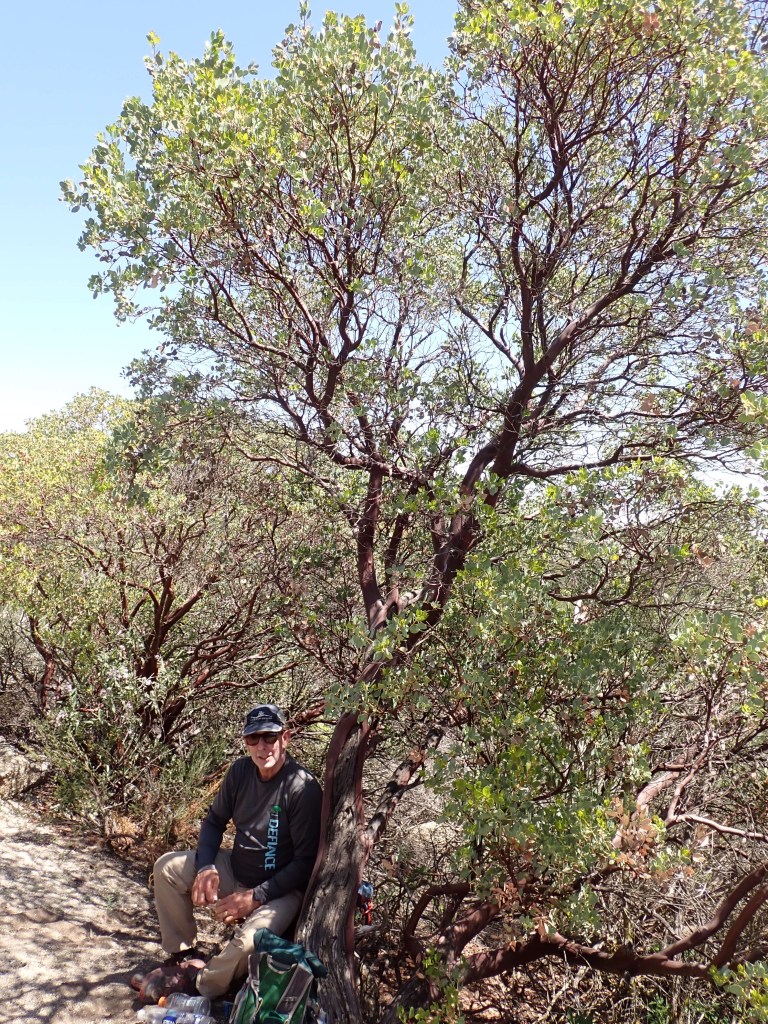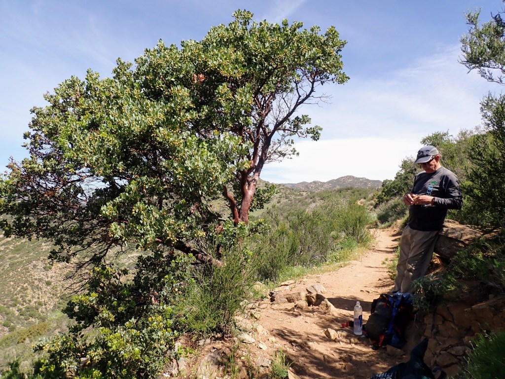 You might be curious why Mike’s often in the lead. The answer is pretty simple; I take a lot of nature photos, So, it’s a lot easier for me to get some images and catch up rather than slow both of us down. Plus, Mike sets a good pace; we average about a 2.5 mile per hour (4 km per hour) pace. Not too bad for a couple of senior citizens – we are both young at heart. We are up high, about 5700 feet (1740 m.), walking through a low oak forest.